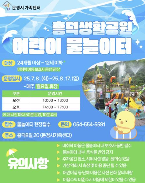문경시는 시민들의 여름철 무더위 해소와 가족 여가 활동 지원을 위해 조성한 흥덕 생활 공원(문경시 가족센터) 물놀이터를 오는 7월 8일부터 개장할 예정이다.작년에 시민들로부터 큰 호응을 받은 물놀이터는 올해도 8월17일까지 약 6주간 운영된다. 주요시설로는 정글 조합 놀이대, 워터슬라이드, 버켓 워터 플레이, 워터 건 등이 있으며, 아이들이 안전하게 이용할 수 있도록 안전요원과 탈의실, 휴게공간도 마련한다.문경시는 시설 개장에 앞서 시설 점검 및 수질 검사 등 사전 준비를 마무리 중이며, 안전하고 청결한 운영을 위해 운영 기간동안 매일 물을 교체하며, 철저한 위생관리로 쾌적한 환경에서 물놀이를 즐길 수 있게 된다.운영시간과 이용 수칙, 안전 수칙 등은 시청 홈페이지 및 현장 안내문을 통해 공지되며 이용 요금은 무료이다.서옥자 여성청소년과장은 “해마다 많은 시민들이 물놀이터를 찾고 있는 만큼, 안전하고 쾌적한 물놀이 환경을 제공하는 데 최선을 다하겠다”며 “아이들과 가족들이 즐거운 추억을 쌓을 수 있길 바란다”고 밝혔다.
