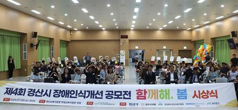 경산시장애인종합복지관은 2일 경산교육지원청 학생교육지원관에서 제4회 경산시 장애인식개선 공모전 시상식을 성황리에 개최했다. 이번 공모전은 `모두가 더불어 함께 사는 세상`을 주제로, 장애인에 대한 편견 해소와 인식 개선을 위해 마련됐으며, 포스터, 에세이, 표어, 사진 부문으로 나눠 경산 지역 초·중·고등학생 및 시민이 제출한 총 261점의 작품을 공정히 심사하여 총 22명의 수상자를 선정했다. 시상식은 윤희란 경산시 부시장과 수상자, 수상자 가족 등 약 100여 명이 참석하여 축하공연, 축사, 시상, 대상 수상자 소감발표로 진행됐으며, 수상자에게는 상장과 함께 후원사인 한국조폐공사 화폐본부와 IM뱅크에서 후원한 문화상품권과 꽃다발 등이 부상으로 주어졌다.에세이 부문 일반부 대상을 수상한 이영재씨는 ˝학창시절 어려웠지만 그 상황을 극복할 수 있었던 계기와 현재 삶에서 장애인과 통합적 삶이 큰 보람을 느끼게 해주고 있음을 담아내었다.”라고 소감을 밝혔다.한편 공모전에 수상한 22개의 작품은 경산교육지원청과 지역 내 유동인구가 많은 장소에 전시될 예정이다.윤희란 부시장은 축사를 통해 ˝공모전 수상자에게 감사와 응원의 박수를 보내며 장애인과 비장애인이 함께 살아갈 수 있는 건강한 지역사회 조성에 지원을 아끼지 않겠다.”라고 말했다.
