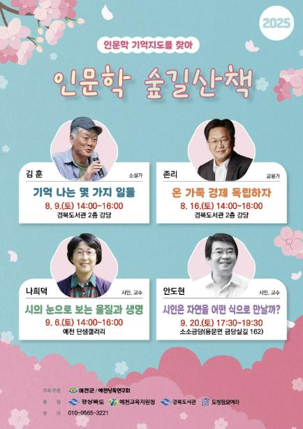 예천군은 다음달 9일 오후2시, 경북도서관 2층 강당에서`칼의 노래`, `남한산성`,`하얼빈`등 베스트셀러 작가로 활동하고 있는 김훈 작가를 초빙해 지역 주민들을 대상으로 ‘기억 나는 몇 가지 일들’을 주제로 인문학 강연을 개최한다.예천군이 주최하고 예천낭독연구회가 주관하는 2025년 주민과 함께하는 인문학아카데미 ‘인문학 숲길산책’은 총 네 차례에 걸쳐 전국 명사들을 초청해 인문학 강연을 한다.이번 강연을 시작으로 8월 16일에는 존 리 금융가, 9월 6일에는 나희덕 시인, 9월 20일에는 안도현 시인을 초청해 다양한 주제로 인문학 강연을 개최할 예정이다.김학동 군수는 “인문학 강연이 지역 문화 발전에 이바지하고 주민들의 풍요로운 삶에 도움이 되길 바란다”며, “관심 있는 주민들의 많은 참여 바란다”고 말했다.