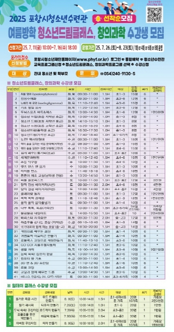 포항시청소년재단 청소년수련관은 오는 11일부터 16일까지 여름방학 특별 프로그램인 ‘청소년 드림클래스’ 및 ‘창의 과학 프로그램’ 수강생을 선착순 모집한다. 이번 여름방학 프로그램은 청소년의 창의성과 문화적 감성을 증진시키기 위한 다양한 체험형 강좌로 구성됐다. 주요 강좌는 ▲국가대표와 함께하는 풋살 ▲역사·바둑 ▲수채화 ▲방송 댄스 ▲줄넘기 ▲탁구 등 스포츠·예술 분야부터, ▲코딩 ▲3D펜 · 3D 프린팅 ▲AI · GPT 활용 수업 등 미래 역량을 키울 수 있는 창의과학 영역까지 폭넓게 마련됐다. 특히 올해는 단기 체험이 가능한 원데이클래스도 개설돼, 다양한 콘텐츠를 부담 없이 경험할 수 있도록 한 점이 특징이다. 해당 클래스는 향후 정규 프로그램 운영을 위한 수강생 피드백 수렴의 의미도 담고 있다. 수강 신청은 7월 11일 오전 10시부터 16일 오후 6시까지 포항시청소년재단 홈페이지에서 온라인 선착순으로 접수하며, 프로그램 운영 기간은 7월 26일부터 8월 23일까지다. 최제민 포항시청소년재단 대표이사는 “무더운 여름, 포항시청소년수련관이 청소년들에게는 배움의 쉼터이자 놀이 공간이 되기를 바란다”며 “청소년들이 창의적이고 건전한 여가 문화를 체험할 수 있도록 다양한 프로그램을 마련했다”고 전했다. 자세한 사항은 포항시청소년재단 청소년수련관으로 문의하면 된다.