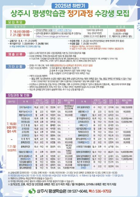 상주시 평생학습원은 지역 내 성인을 대상으로 2025년 하반기 정기과정 수강생을 모집한다. 모집 기간은 7월 16일부터 21일까지 6일간이며, 교육 기간은 8월 4일부터 11월 21일까지 총 16주 과정으로 진행된다.이번 하반기 교육과정은 △직업능력 강좌 3개(조리기능사, 제과기능사, 제빵기능사), △문화예술 강좌 22개(라인댄스, 요가, 캘리그라피 등), △인문교양 강좌 10개(홈베이킹, 홍차소믈리에 등)로 시민의 다양한 학습 수요를 반영한 실용적이고 특색있는 프로그램들로 마련됐으며, 총 35개 강좌에 497명을 모집한다. 상주시에 주소 또는 직장을 둔 성인은 모두 신청할 수 있다. 수강료는 2만 원이며, 재료비 및 교재비는 본인 부담이다.수강 신청은 7월 16일부터 7월 21일까지 상주시청 홈페이지 통합예약시스템을 통해 이루어지며, 선착순으로 모집한다. 자세한 사항은 평생학습원 홈페이지 공지 사항 또는 전화로 문의하면 안내받을 수 있다.권양희 평생학습원장은 “이번 하반기 정기과정을 통해 시민들이 일상속에서 배움의 즐거움을 느끼고, 지역 사회와 함께 성장하는 기회가 되기를 바란다.”라고 말했다.
