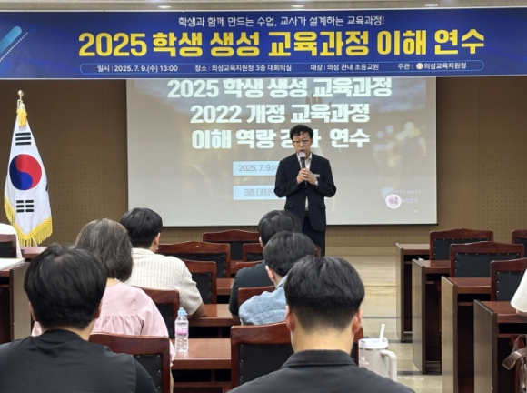 의성교육지원청은 2025년 7월 9일, 관내 초등학교 교원 33명을 대상으로 `2025학년도 학생 생성 교육과정 및 2022 개정 교육과정 이해 역량 강화 연수`를 본청 3층 대회의실과 중회의실에서 운영했다. 이번 연수는 ‘학생과 함께 만드는 수업, 교사가 설계하는 교육과정’을 주제로, 교원의 교육과정 설계·운영 역량을 강화하고 학교 현장 중심의 실행력을 높이기 위해 마련됐다.연수는 A반과 B반, 두 개 분임으로 나뉘어 진행됐으며, 봉성초 이응석 교사와 의성초 최동관 늘봄지원실장이 각각 ‘학생 주도성, 생성 교육과정으로 함께 찾아봐요’와 ‘왜? 2022 개정 교육과정일까’를 주제로 강의했다. 교원들은 각 분임을 교차 수강하며 실습과 사례 중심의 활동을 통해 수업 설계 방안을 체계적으로 탐색하고 협의하는 시간을 가졌다.이번 연수를 통해 교사들은 교육과정-수업-평가-기록의 일체화 방안에 대한 실제 사례를 공유하고, 학생 주도 수업 문화를 정착시키기 위한 실천적 전략을 함께 모색했다.이우식 교육장은 “학생 중심 교육과정을 교사가 직접 설계하고 실행하는 현장 중심 연수의 중요성이 더욱 커지고 있다. 이번 연수를 계기로 교원의 교육과정 전문성이 한층 강화되고, 학생 주도형 수업이 학교 현장 전반으로 확산되기를 기대한다.”고 말했다.