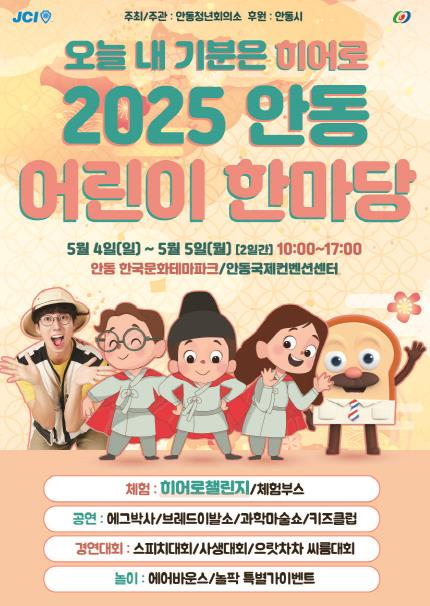 안동시와 안동청년회의소는 제103회 어린이날을 맞이해 5월 4일부터 5월 5일까지 이틀간 한국문화테마파크와 안동국제컨벤션센터 일대에서 ‘2025 안동 어린이 한마당’을 개최한다.이번 행사는 “오늘 내 기분은 히어로!”라는 주제로 어린이들이 직접 영웅이 되는 꿈과 희망을 현실로 만들어 주기 위해 기획됐으며, 어린이와 가족 모두가 함께 참여하고 즐길 수 있는 다양한 체험활동과 평소 보기 어려운 공연을 무료로 볼 수 있도록 준비했다.첫날인 5월 4일은 컨벤션센터 대회의실에서 인기 유튜버 에그박사의 공연을 시작으로, 오후에는 2회에 걸쳐 ‘브레드이발소 싱어롱쇼:빵스타 오브 뮤직쇼’ 공연이 있고, 테마파크 설화극장에서는 제1회 어린이 스피치대회, 종루광장에서는 버스킹공연 및 가족이 함께 참여할 수 있는 가족오징어게임 등 레크레이션과 최형배 마술사의 과학원리를 이용한 과학마술콘서트 공연도 준비돼 있어 어린이들의 호기심과 창의력을 자극할 예정이다.5월 5일(월)에는 ‘제103회 어린이날 기념식’이 컨벤션센터 대회의실에서 10시 30분 오프닝공연을 시작으로 열린다. 어린이권리헌장 낭독, 모범어린이 표창, 어린이날 노래, 축하 세레모니 순으로 진행되고, 안동MBC어린이 합창단 공연 및 드리밍매직쇼가 축하공연으로 펼쳐진다.또한 테마파크 종루광장에서도 댄스 및 태권도 공연, 레크레이션, 그리고 인기 DJ 세포의 ‘키즈 디제잉 파티’가 펼쳐져 어린이들에게 흥겨운 축제 분위기를 선물한다. 부대행사로는 119소방훈련, 소방차․순찰차 전시 및 체험, 그림 머그 만들기, 유리공예 체험 등 20여 개의 체험부스와 에어바운스를 설치해 어린이들이 신나게 놀 수 있는 공간을 마련했으며, 어린이 백일장 및 사생대회와 놀이터 디자이너인 편해문과 함께하는 어린이날 Pop-up 자유놀이터도 진행한다.특히, 올해 처음으로 기획한‘히어로 챌린지’는 △까투리 친구들을 구해줘 △히어로, 정의의 가면을 만들어줘 △몽실언니의 숙제를 해결해줘 △삼태사의 후예가 되어줘 △강아지똥을 감옥에서 구출해줘 △간고등어의 육지 여행을 도와줘 △원이 엄마의 편지를 전해줘 7가지로, 테마파크 곳곳에서 어린이들이 히어로 챌린지의 미션을 모두 완료하면 7개의 뱃지와 히어로 인증서를 수여해 아이들이 영웅으로 성장하는 경험을 선사하고자 한다.행사 기간 시민의 접근성을 높이기 위해 탈춤공원 건너편 강변둔치에서 구 안동역을 경유해 안동국제컨벤션센터를 순환하는 무료 셔틀버스도 운영해 교통 편의를 제공한다.권기창 안동시장은 “대형 산불로 많은 시민이 어려움을 겪고 있는 상황이지만, 어린이만큼은 꿈과 상상의 나래를 접지 않길 바라는 마음에서 이번 행사를 준비했다 며 “많은 가족이 함께 웃고 소중한 추억을 만드는 어린이날이 되길 바란다”고 밝혔다.