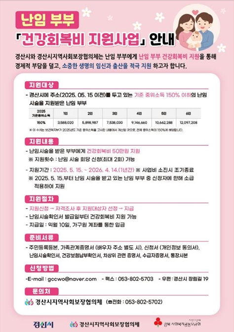 경산시지역사회보장협의체와 경산시는 저출생 극복을 위한 지원 대책의 일환으로 지난 5월 15일부터 난임부부 건강회복비지원사업을 추진 중이다. 본 사업은 지난해 저출생 극복 캠페인 성금으로 진행됐으며, 새 생명의 출발에 희망을 더하는 것을 목적으로 한다.경산시는 난임 부부의 신체적·심리적 회복을 지원하고자 이 사업을 추진하게 됐으며, 박채아 경북도의원의 도정 질의에서도 난임 관련 현안이 다뤄진 바 있다.사업 대상은 기준중위소득 150% 이하 가구로 부부당 최대 100만원(회당 50만원, 2회)을 지원하며, 사업 기간은 2025년 5월 15일부터 2026년 4월 14일까지이다.정인숙 경산시지역사회보장협의체 위원장은 “아이를 낳고 기르는 문제는 가정의 몫이 아니라 사회 전체가 함께 고민해야 할 문제이다. 이번 지원이 출산을 준비하는 부부들에게 힘이 되기를 바란다”고 말했다. 조현일 경산시장은“이번 사업은 시민들의 자발적 나눔이 만든 결실로, 출산을 준비하는 부부들에게‘당신 곁에 늘 함께하는 따뜻한 손길이 있다.’라는 메시지로 전해지기를 바란다.”고 전했다.신청은 팩스 또는 이메일을 통해 접수할 수 있으며, 관련 문의는 경산시지역사회보장협의체로 하면 된다.