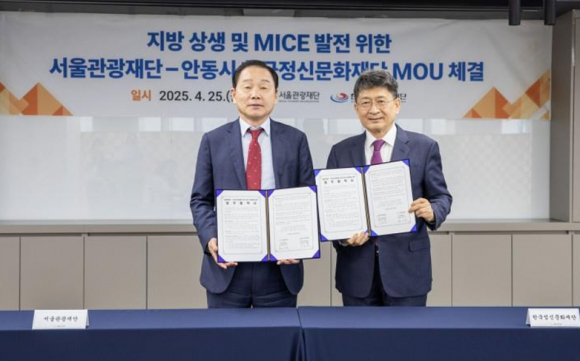 한국정신문화재단은 지난 4월 25일, 서울관광플라자에서 서울관광재단과 관광 및 MICE 산업의 상생발전을 위한 업무협약(MOU)을 체결했다.이번 협약은 관광과 MICE 산업의 지속가능한 협력 기반을 구축하고, 도시 간 연계를 통한 지역 관광 생태계의 공동 성장을 실현하기 위한 전략적 조치로 추진됐다.양 기관은 이번 협약을 통해 다음과 같은 분야에서 협력을 확대해 나가기로 뜻을 모았다.- 관광·MICE 관련 정보 공유 및 정책 협력- 관광·MICE 산업 육성을 위한 공동사업 운영- 협력 네트워크 구축 및 교류 프로그램 활성화한국정신문화재단은 유네스코가 지정한 세계유산(도산서원, 병산서원, 봉정사, 하회마을), 세계무형유산(하회별신굿탈놀이), 세계기록유산(유교책판 등)을 모두 보유한 ‘유네스코 트리플 크라운’ 도시 안동의 정신문화 자산을 토대로, 지역 MICE 거점 시설인 안동국제컨벤션센터 ADCO와 ‘코리아 유니크베뉴(Korea Unique Venue)’로 인증된 한국문화테마파크를 중심으로 한 차별화된 콘텐츠를 통해 관광·MICE 산업의 융복합을 선도하고 있다.서울관광재단은 글로벌 관광도시로서의 브랜드 경쟁력과 인프라를 바탕으로, 한국정신문화재단과의 협업을 통해 수도권과 지역이 상생하는 관광·MICE 공동 생태계 구축에 기여하고자 한다.이동원 한국정신문화재단 대표이사는 “이번 협약은 안동이 보유한 세계적 문화자산과 MICE 인프라가 서울의 글로벌 네트워크와 만남으로써, 지역 중심의 관광 MICE 모델이 전국은 물론 국제 무대로 확장되는 전환점이 될 것”이라며, “문화와 산업이 어우러지는 지속가능한 생태계를 구축해 나가겠다”고 밝혔다.