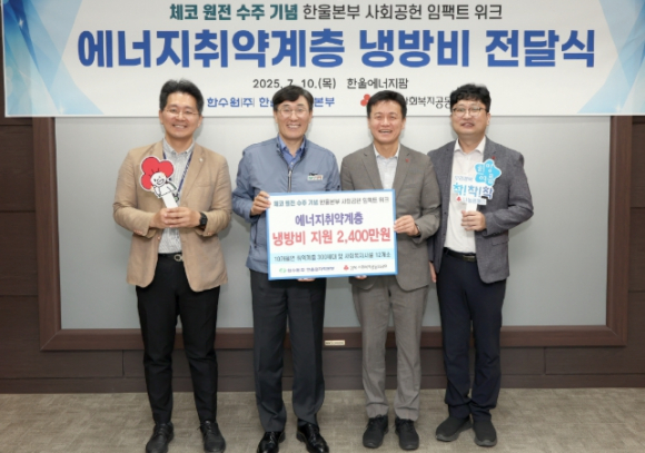 한국수력원자력(주) 한울원자력본부는 7월 10일, 울진군 에너지 취약계층을 위한 냉방비 2,400만원을 사랑의열매 경북사회복지공동모금회를 통해 전달했다.이번 지원은 한국수력원자력의 체코 원전 수주를 기념해 한울본부가 추진하는 ‘사회공헌 임팩트 위크’의 일환으로, 임직원 기부금으로 조성된 민들레홀씨기금으로 마련됐다.지원금은 관내 사회복지시설 12곳에 900만원, 에너지 취약계층 300세대에 세대당 5만원씩 총 1,500만원이 전달될 예정이다.이세용 본부장은 “체코 원전 수주라는 뜻깊은 성과와 함께, 지역사회를 위한 나눔까지 이어져 의미있다고 생각한다. 유례없는 폭염 속 냉방비 지원이 실질적인 도움이 되길 바라며, 앞으로도 따뜻한 나눔을 지속적으로 이어가겠다”고 밝혔다.