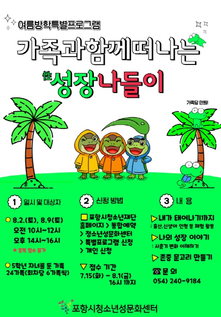 포항시청소년재단청소년성문화센터는 여름방학을 맞아 초등학교 5학년 자녀를 둔 가족을 대상으로 특별 성교육 프로그램인 ‘가족과 함께하는 성(性)장 나들이’를 운영하며, 오는 15일부터 8월 1일까지 선착순으로 참가자를 모집한다. 이번 프로그램은 부모와 자녀가 함께 참여하는 체험 중심의 가족 성교육으로, 올바른 성 가치관 형성과 가족 간 유대감을 높이기 위해 기획됐다. 교육은 ▲내가 태어나기까지–태아 발달 과정, 출산과 신생아 인형 체험 ▲나의 성장 이야기–사춘기 이해 퀴즈 및 변화에 대한 가족 대화 ▲존중 문고리 만들기 등 놀이와 체험활동을 결합한 실습형 교육으로 진행된다. 프로그램은 오는 8월 2일과 9일, 오전 10시와 오후 2시 총 4회에 걸쳐 포항시청소년성문화센터 교육실에서 진행될 예정이다. 정태영 포항시청소년성문화센터장은 “가족이 함께하는 성교육을 통해 자녀는 존중받는 경험을, 부모는 자녀를 이해하는 기회를 가질 수 있다”면서 “이번 프로그램이 가족 간의 소통을 넓히고 건강한 성문화 형성에 도움이 되기를 기대한다”고 밝혔다. 참가 신청은 포항시청소년재단 홈페이지에서 가능하며, 모집 인원은 선착순으로 제한된다. 자세한 일정 및 문의는 청소년성문화센터로 하면 된다.