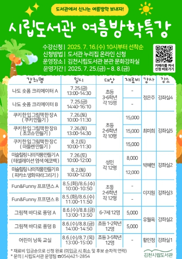 김천시립도서관(관장 이신기)에서는 여름방학과 휴가를 맞은 시민들의 건강한 여가생활을 지원하기 위해 여름방학 특강을 운영한다. 이번 특강은 오는 7월 25일부터 8월 8일까지 시립도서관 본관과 율곡도서관에서 운영되며, 어린이와 성인들을 대상으로 독서 활동, 창의 체험, 생태체험 등 다양한 강좌들이 진행된다. 주요 강좌는 △그림책 뮤직 테라피 △나도 숏폼 크리에이터 △곤충 생태 교실 △미술 힐링 나의 작품 만들기 △자개 책갈피 만들기 △어린이 낭독 교실 등으로, 총 22개 강좌가 준비돼 있다. 참여자 모집은 7월 16일 오전 10시부터 도서관 누리집에서 선착순으로 진행되며, 희망자는 강의 내용과 재료비 등을 확인한 후 인터넷으로 신청하면 된다. 이신기 시립도서관장은 “건강을 해치기 쉬운 무더운 여름, 이번 특강이 시민들이 도서관에서 독서와 함께 새로운 경험도 할 수 있는 계기가 되길 바란다.”라며 많은 관심과 참여를 당부했다. 그밖에 자세한 내용은 도서관 누리집 공지사항을 참고하거나 시립도서관과 율곡도서관으로 문의하면 된다.