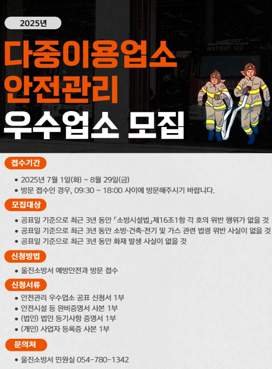 울진소방서는 오는 8월 29일까지 ‘2025년 다중이용업소 안전관리 우수업소’ 지정을 위한 신청 접수를 받는다고 14일 밝혔다.이번 우수업소 지정은 다중이용업소의 자율적인 안전관리 문화 정착과 화재 예방을 통한 안전한 지역사회 구현을 목적으로 추진된다.신청 대상은 `다중이용업소의 안전관리에 관한 특별법` 등 관련 법령상 요건을 충족하는 관내 다중이용업소다. 최근 3년 동안 화재 발생 사실이 없고, 소방·건축·전기·가스 등 관계 법령을 위반한 이력이 없으며, 소방시설법 제16조 제1항 각호의 위반행위가 없어야 한다.신청을 희망하는 업소는 울진소방서 예방안전과를 직접 방문하거나 우선 전화로 문의 후 신청서류를 제출하면 된다. 접수 및 문의는 울진소방서 예방안전과에서 가능하다.지정된 우수업소에는 소방서장 표창과 함께 현판 수여, 소방특별조사 면제, 공식 홈페이지 및 언론 홍보등 다양한 인센티브가 제공된다.울진소방서 관계자는 “이번 우수업소 지정은 자율안전관리 문화 확산과 안전 모범 사례 발굴을 위한 중요한 계기”라며 “많은 다중이용업소의 적극적인 참여를 바란다”고 전했다.