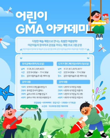 김천시시설관리공단(이사장 김재광)이 운영하는 김천시립미술관의 여름방학 맞이 교육프로그램인 `어린이 GMA 아카데미`가 시민들의 뜨거운 호응 속에서 접수 시작 2분만에 전회차가 마감되며 모집을 마쳤다. 이번 어린이 GMA아카데미는 여름방학을 맞아 어린이들이 다양한 예술 체험을 통해 창의력과 감성을 키울 수 있도록 기획된 체험형 교육프로그램으로 7월26일 토요일부터 시작된다. △유리공예(매주 토요일) 1회차 모자이크 캔들홀더, 2회차 유리컵 전사지, 3회차 글라스 아트도어벨, 4회차 후우링 모빌 만들기 수업 △도자기핸드페인팅(매주 일요일) 나만의 식기세트만들기로 각각 4회차로 구성되어있다. 김재광 이사장은 “관내 어린이들의 문화향유기회를 넓히고, 예술 교육의 공공성을 강화하기 위한 노력을 계속 이어나갈 계획이다.”며 “앞으로도 맞춤형 문화예술 교육프로그램을 지속 확대해 지역문화기반 강화에 힘쓰겠다.”고 밝혔다.
