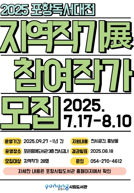 포항시는 오는 9월 포항시립포은흥해도서관에서 열리는 2025 포항독서대전 ‘지역작가전’에 참여할 작가 28명을 모집한다. 모집 기간은 이달 17일부터 8월 10일까지이며, 포항 출신이거나 거주하며 작품 활동을 하고 1권 이상의 정식 출판 도서를 보유한 작가라면 지원할 수 있다. ‘지역작가전’에 선정된 작가는 주관처에서 제공하는 공간에 저서와 관련 물품 등으로 자신만의 전시 공간을 꾸미고 작품을 소개할 수 있다. 이번 전시는 지역 작가들에게 작품 발표의 기회를 제공하고 창작 의욕을 높여 지역 문학 발전에 기여하는 한편, 시민들에게는 다양한 문학 작품을 접할 수 있는 기회를 제공하고자 기획됐다. 전시 기간은 ‘2025 포항독서대전’을 시작으로 약 1년간 이어진다. 참가에 관련한 자세한 사항은 포항시립도서관 홈페이지 공지사항에서 확인할 수 있다. 서양진 포항시립도서관장은 “지역 작가들의 작품을 전시하고 홍보함으로써 지역 문학에 대한 관심을 높이고, 작가들의 창작 활동을 지원해 지역 작가와 시민 간의 문화교류와 소통으로 지역 문학이 활성화되길 바란다”고 말했다.
