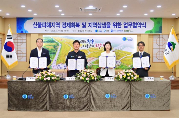 청송군은 지난 14일, 산불 피해지역의 신속한 경제 회복과 지역-기업 간 상생 발전을 도모하기 위해 ㈜경농, ㈜텔로팜, 한국에브리팜(주)와 ‘산불피해지역 경제회복 및 지역 상생을 위한 업무협약’을 체결했다고 밝혔다. 이번 협약의 주요 내용은 ▲청송 스마트농업복합문화지구 개발 협력 ▲첨단 농업 신기술 및 스마트팜 도입 ▲지역 주민의 일자리 창출 및 경제 활성화 지원 등이다. 청송군은 이번 협약을 계기로 산불로 어려움을 겪고 있는 지역사회에 실질적인 회복 기반을 마련하고, 첨단 농업 기술을 접목한 ‘스마트농업복합문화지구’를 성공적으로 조성해 미래 지향적인 농업 혁신 모델을 제시할 계획이다. 윤경희 청송군수는 “이번 협약은 청송의 농업과 지역경제를 한 단계 도약시킬 중요한 출발점”이라며, “특히 스마트팜 및 농업 분야를 선도하는 ㈜경농이 함께하게 되어 더욱 기대가 크다.”라고 말했다. 이어 “앞으로 민간기업과의 긴밀한 협력을 통해 지역경제 회복은 물론, 지속 가능한 농업 생태계 조성에도 힘쓰겠다.”고 강조했다. 협약에 참여한 ㈜경농, ㈜텔로팜, 한국에브리팜(주) 관계자들도 “청송군과의 협력을 통해 기술과 자원을 아낌없이 지원하며, 상생의 가치를 실현하는 데 기여하겠다.”라고 밝혔다. 한편, 청송군은 이번 협약을 계기로 지역의 위기를 기회로 전환하고, 첨단기술 기반의 지속 가능한 지역 발전을 위한 민관 협력 체계를 더욱 강화해 나갈 방침이다.