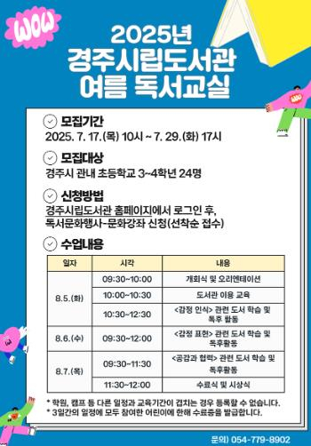 경주시립도서관은 여름방학을 맞아 관내 초등학교 3~4학년 학생을 대상으로 ‘2025년 여름 독서교실’을 오는 8월 5일부터 7일까지 3일간 운영한다고 17일 밝혔다. 이번 독서교실은 시립도서관 1층 회의실에서 열리며, 총 24명의 학생이 참여할 예정이며, 초등학생들의 도서관 이용을 활성화하고 독서에 대한 흥미를 높이기 위해 마련됐다.‘감정’을 주제로 한 이번 교육은 관련 도서를 함께 읽고, 학생들이 서로 공감하고 즐길 수 있는 다양한 독후활동으로 구성돼 있다. 이를 통해 학생들은 자신의 감정을 자연스럽게 표현하고, 친구들과 ㅅ호통하며 협력하는 태도를 배울 수 있도록 운영된다.또한 독서교실 과정에서는 도서관 이용법과 예절을 배우고, 올바른 독서 습관을 형성할 수 있는 교육도 함께 이뤄진다.모든 과정을 마친 후에는 우수 참여자를 선발해 국립어린이청소년도서관장상(1명)과 경주시립도서관장상(5명)을 수여할 예정이다.참여 신청은 7월 17일 오전 10시부터 29일 오후 5시까지 경주시립도서관 홈페이지의 ‘독서문화행사–문화강좌 신청’ 메뉴를 통해 선착순으로 접수할 수 있다. 기타 자세한 사항은 경주시립도서관 홈페이지 공지사항을 참고하거나 어린이자료실로 문의하면 된다.