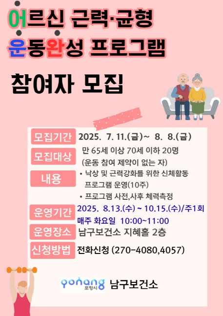 포항시 남구보건소는 오는 8월부터 운영하는 어르신 대상 ‘근력·균형 운동 완성 프로그램(이하 어운완)’의 참여자를 모집한다. ‘어운완’은 고령자들의 건강한 노후생활을 지원하기 위해 기획된 신체활동 프로그램으로, 낙상 예방과 근력 강화를 주요 목표로 삼아 집에서도 손쉽게 따라할 수 있는 동작들로 구성됐다. 이번 프로그램은 8월 13일부터 매주 화요일 오전 10시, 총 10주간 남구보건소 2층 지혜홀에서 진행된다. 참가 대상은 운동에 지장이 없는 만 65세부터 70세 이하의 어르신 20명이며, 신청은 8월 8일까지 남구보건소 통합건강관리실(☎270-4080, 4081)로 전화 접수하면 된다. 특히 이번 교육은 포항국민체력100 체력인증센터와 연계, 프로그램 시작 전과 종료 후 체력 측정으로 신체 변화 효과를 비교·분석함으로써 프로그램의 실효성을 높일 예정이다. 김정임 남구보건소장은 “낙상은 노년기 삶의 질을 떨어뜨리는 주요 위험 요인으로, 이를 예방하기 위해서는 근력 향상이 무엇보다 중요하다”며, “체계적인 운동 프로그램으로 어르신들의 자가 건강관리 역량을 강화하고, 건강한 지역사회를 만드는 데 힘쓰겠다”고 밝혔다.