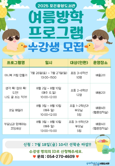 포항시립포은중앙도서관은 여름방학을 맞아 지역 내 초등학생을 대상으로 하는 방학 특화프로그램 수강생을 18일 오전 10시부터 선착순으로 모집한다. 프로그램은 오는 26일부터 8월 11일까지 운영되며 웹툰, 글쓰기, 코딩 등 총 4개의 창의융합형 강좌로 구성된다. 이번 여름방학 프로그램은 학생들이 다양한 주제를 체험하며 창의성과 표현력을 키울 수 있도록 기획됐다. 먼저 이달 26~27일에는 초등학생 3~6학년을 대상으로 여름에 관한 책을 읽고, 미니 북과 미니 북 키링을 직접 만들어보는 ‘웹툰 만들기’ 수업이 열린다. 이어 8월 2일부터 10일까지 매주 토·일요일에는 초등학생 2~6학년을 위한 ‘생각 톡! 창의 톡! 도전! 나도 글 쓰는 작가!’ 수업으로 다양한 글쓰기 기법을 배우고 자신의 이야기를 직접 써보는 시간을 갖는다. 또한 8월 3일부터 10일까지 매주 일요일에는 ‘코딩 패밀리’와 ‘부모님과 함께하는 코딩세상’이 열려 초등학생 자녀와 보호자가 함께 코딩의 기초를 익힐 수 있는 가족 참여형 수업이 진행된다. 포항시립포은중앙도서관 관계자는 “여름방학 프로그램은 어린이들의 창의적 사고와 자기 표현력을 키울 수 있도록 다채롭게 준비됐다”며 “많은 가족이 참여해 유익한 방학 시간이 되기를 바란다”고 전했다. 프로그램 참가 신청은 포항시립도서관 홈페이지에서 할 수 있으며, 기타 자세한 사항은 홈페이지 공지사항 또는 포은중앙도서관으로 문의하면 된다.
