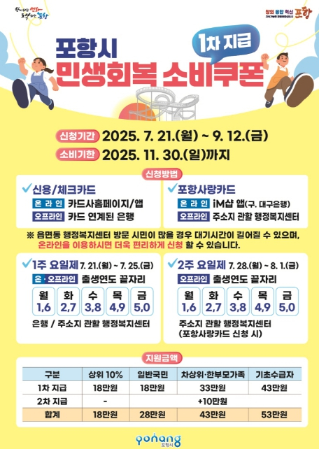 포항시는 오는 21일부터 시작되는 ‘민생회복 소비쿠폰’ 지급을 앞두고, 시민 누구나 쉽고 빠르게 신청할 수 있도록 맞춤형 현장지원 체계를 본격적으로 운영한다고 밝혔다. 시에 따르면 전담 태스크포스(TF) 운영, 읍면동 접수창구 설치, 찾아가는 방문 신청, 콜센터 운영 등 신속하고 체계적인 시스템을 구축해 시민 불편을 최소화할 계획이다. 민생회복 소비쿠폰 전담TF는 장상길 부시장을 단장으로 관련 부서와 29개 읍면동 담당자가 참여해 신청부터 지급, 사후 처리까지 전 과정을 총괄한다. 시는 시민 누구나 쉽게 신청할 수 있도록 29개 읍면동 행정복지센터에 전담 창구를 마련하고, 평일 근무시간 내 현장 접수를 지원한다. 또한, 거동이 불편한 고령자와 장애인을 위한 ‘찾아가는 접수창구’도 운영하고 생활지원사 452명이 독거노인 약 3만 5천 명에게 신청 방법을 안내하는 등 취약계층 신청이 누락되지 않도록 할 계획이다. 전담 콜센터도 운영해 신청 절차, 지급 금액, 사용 방법 등 문의에 신속하고 정확하게 안내할 예정이다. 이번 소비쿠폰은 신용·체크카드, 모바일·카드형 포항사랑상품권 등으로 지급되며, 사용기한은 11월 30일까지로 한정된다. 한편, 현장 접수는 출생연도 끝자리 기준 5부제로 진행된다. 이달 21일부터 8월 2일까지 2주간 월요일(1·6), 화요일(2·7), 수요일(3·8), 목요일(4·9), 금요일(5·0)에 신청할 수 있고, 주말에는 온라인 접수만 가능하다. 1차 지급분은 포항시민의 경우 18만 원에서 최대 43만 원까지 차등 지급되며, 9월 22일 이후 지급되는 2차 분은 소득 상위 10%를 제외한 90% 국민에게 1인당 10만 원이 추가 지원된다. 단, 1차에 소비쿠폰을 신청하지 않으면 지급 대상에서 제외되어 2차 신청도 불가능하므로 반드시 기간내 신청해야 한다. 이강덕 포항시장은 “이번 소비쿠폰이 지역경제에 활력을 불어넣는 계기가 되길 기대한다”며 “보다 신속한 민생경제 회복을 위해 기한 내 소진이 필요한 만큼 시민 누구나 빠짐없이 신청하고 편리하게 사용할 수 있도록 모든 행정력을 총동원하겠다”고 말했다.