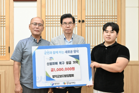 영덕군보디빌딩협회가 경북산불의 피해를 복구하는 데 써달라며 지난 17일 김광열 영덕군수를 만나 성금 100만 원을 기탁했다.윤무섭 협회장은 “작은 정성이지만 산불 복구에 함께하고자 회원들의 마음을 모아 성금을 마련했다”며, “지역사회가 겪은 아픔을 나누고 발전에 이바지하는 협회가 되도록 노력하겠다”라고 뜻을 전했다.