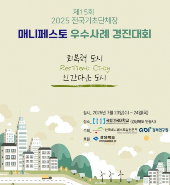 ‘2025 전국 기초단체장 매니페스토 우수사례 경진대회’가 오는 7월 23일부터 24일까지 이틀간, 국립경국대학교 안동캠퍼스에서 개최된다.이번 대회는 한국매니페스토실천본부와 경북연구원이 공동으로 주최하며, ‘회복력 도시, 인간다운 도시’를 주제로 지방정부의 정책 성과를 공유하고 각 지자체의 경험과 성과를 살펴보며 함께 배우는 자리로 마련됐다.경진대회는 ▲경제 및 지역 산업 ▲불평등 완화 ▲인구구조 변화 대응 ▲안전 및 재난 관리 ▲기후․환경․생태 ▲사회적 자본 ▲공동체 강화 등 7개 분야별 정책 사례를 심사․발표하는 방식으로 진행되며, 전국 159개 기초자치단체가 참여해 191건의 우수 정책 사례를 발표할 예정이다.행사 기간에는 ‘위험사회와 재난불평등’, ‘회복력 사회로의 전환’을 주제로 한 초청 강연도 진행된다. 강연에서는 일상 속 위기와 불균형 문제를 돌아보고, 함께 회복해 나갈 수 있는 사회에 대해 다양한 관점을 공유하는 시간이 될 것으로 기대된다.전국 2,000여 명의 공무원이 참석하는 대규모 행사인 만큼, 안동시는 고향사랑기부제는 물론 지역의 관광 명소와 여름 축제를 널리 알리기 위한 홍보를 함께 진행할 예정이다.안동시 관계자는 “이번 대회는 지방정부의 회복력 강화와 지자체 간 정책 네트워크 구축을 위한 뜻깊은 자리가 될 것”이라며, “공유된 우수사례를 통해 정책 아이디어를 얻고, 앞으로 안동시 정책에도 적극 반영해 나가겠다”라고 밝혔다. 이어 “앞으로도 지방자치의 발전과 회복력 있는 도시 실현을 위해 꾸준히 노력하겠다”라고 덧붙였다. 한편, 안동시는 2023년과 2024년 대회에서 2년 연속으로 최우수상을 수상한 바 있다.