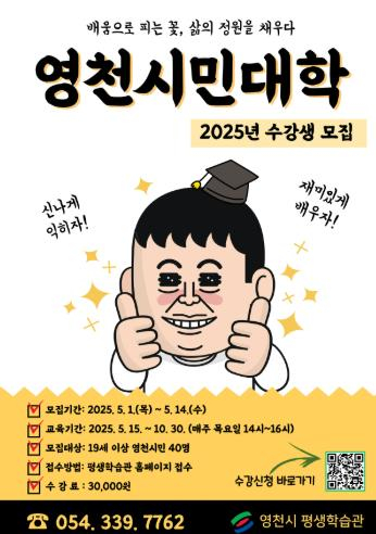 영천시 평생학습관은 ‘2025년 영천시민대학’ 수강생 40명을 5월 1일부터 12일까지 선착순으로 모집한다고 밝혔다.영천시민대학은 19세 이상 시민이라면 누구나 참여할 수 있는 평생학습관의 연간 교육 프로그램으로, 매주 인문·교양, 문화·예술, 지역학 등 다양한 분야의 전문가 특강으로 구성되어 있다. 올해는 5월 15일부터 10월 30일까지 24주간 매주 목요일 오후 2시부터 4시까지 진행된다.수강 신청은 평생학습관 홈페이지를 통해 가능하며, 수강료는 30,000원이다.온라인 접수가 어려운 시민들은 모집기간 동안 평생학습관에서 평일 오전 9시부터 오후 6시까지 수강 신청 도우미 서비스를 제공받을 수 있다.최기문 영천시민대학 학장은 “영천시의 평생학습 문화 정착을 위해 시민이 만족하는 양질의 교육을 제공하고, 배움으로 행복한 시민대학으로 성장해 나가겠다”며, “시민들의 많은 관심과 참여를 바란다”고 전했다.기타 자세한 사항은 영천시 평생학습관 홈페이지를 참고하거나 평생학습관 교육운영분야로 문의하면 안내받을 수 있다.