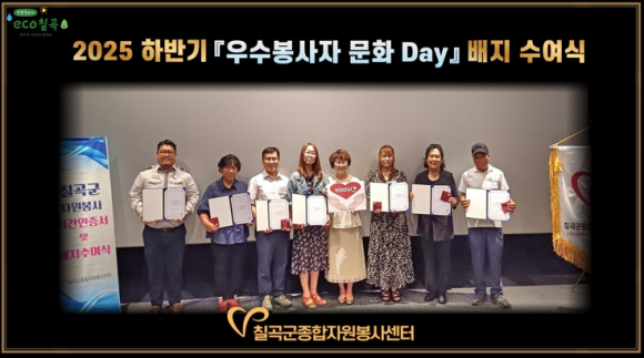 칠곡군종합자원봉사센터는 지난 7월 16일, 올해 두 번째로 ‘우수봉사자 문화 Day’를 개최하고, 지역사회를 위해 헌신한 자원봉사자 43명에게 자원봉사 시간 인증서 및 배지를 수여했다.이번 행사는 우수봉사자의 노고를 인정하고 격려하는 차원에서 마련됐으며, 배지 수여식 후에는 칠곡호이영화관에서 영화관람 시간을 갖는 등 우수봉사자들이 문화생활도 함께 즐길 수 있도록 구성됐다.이은숙 소장은 “오늘 수여된 시간 인증서와 배지는 여러분의 헌신과 노력에 대한 작지만 진심 어린 상징입니다”라며, “앞으로도 자원봉사자 여러분이 자부심을 느끼고 지속적으로 활동할 수 있도록 다양한 인정 및 보상 프로그램을 이어가겠다”고 밝혔다.