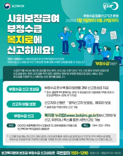 울진군은‘사회보장 급여 및 보건복지분야’부정수급 근절을 위해 7월 9일부터 8월 29일까지 집중 신고 기간으로 정하고 운영에 들어갔다. 이번 집중 신고 기간은 사회보장 급여 수급자의 소득·재산 변동사항 누락, 허위신고, 시설·기관의 보조금 부정수급 등 각종 부정수급을 사전에 예방하고, 정당한 복지 수급권자가 보호받을 수 있도록 하기 위해 추진된다. 신고대상은 기초생활보장, 기초연금, 장애인연금 등 사회보장급여 부정수급, 사회복지시설 보조금을 부정한 방법으로 받거나, 목적외로 사용하는 행위 등이다. 신고는 복지로 홈페이지, 우편(보건복지부 복지급여 조사담당관), 팩스를 통해 가능하며, 실명 또는 익명으로 신고할 수 있다. 신고자의 신원은`공익신고자 보호법`에 따라 보호된다. 또한, 복지로를 통해 신고하고 부정수급 환수가 발생한 경우 국가가 포상금을 지급할 수 있기에 신고에 대한 상담은 문의하면 된다. 손병복 울진군수는“복지제도의 신뢰성과 지속가능성을 확보하기 위해 부정수급 근절이 무엇보다 중요하다”며“앞으로도 복지사각지대 해소와 함께 복지재정 누수를 방지하기 위해 지속적으로 노력하겠다”라고 말했다.