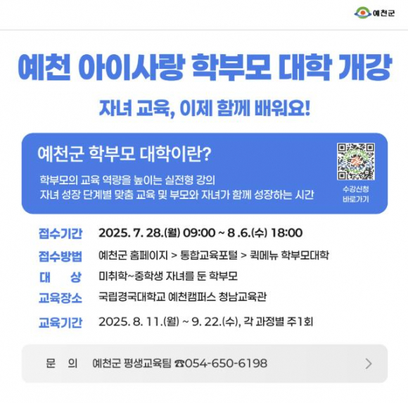 예천군은 지역 학부모들의 자녀 이해와 양육 역량 강화를 위해 운영되는 ‘예천 아이사랑 학부모 대학’ 수강생을 이달 28일부터 8월 6일까지 모집한다.이번 학부모대학은 8월 11일부터 국립경국대학교 예천캠퍼스 청남교육관에서 진행되며, 예천군에 거주하는 미취학 자녀부터 중학생 자녀를 둔 학부모를 대상으로 맞춤형 교육과정을 제공한다.교육은 8월 11일부터 9월 24일까지 6주간 주 1회씩 운영되며, 자녀 성장단계에 따라 △첫걸음 과정(미취학 자녀 및 예비부모) △배움·자람 과정(초등학생 학부모) △진로 설계 과정(중학생 학부모) 등 3개 과정으로 구성된다.각 과정은 정서적 안정, 학습 습관 형성, 진로 설계 등 실질적인 부모 역할에 초점을 맞춰 과정별 총 7회차 수업과 특별강연 2회로 운영된다.EBS다큐프라임에 하버드대 마이클 샌델 교수와 함께 세계 최고 교수 11인으로 소개된 조벽 고려대 석좌교수, 독일·스위스에서 아동트라우마 치료전문훈련을 수련하고 아이들의 감정코칭 관련 다수의 저서를 출간한 최성애 박사, 유럽에서 주목받는 과학 커뮤니케이터로 이름을 알리고 뇌과학분야에서 다양한 방송과 저서를 통해 대중에게 전달하는 장동선 뇌과학자, 사고와 학습전략 등 학습·인지이론에 기반한 교육심리학의 최고 권위자 서울대학교 신종호 교수, 대한성학회 회장으로 어려운 아이들 성교육을 쉽게 풀어내기 위해 노력하는 배정원 대표 등 저명한 강연자들을 초청해 보다 깊이 있는 교육을 진행할 예정이다.본 교육은 자녀를 둔 예천군민이라면 누구나 참여할 수 있으며 접수는 이달 28일 09:00부터 8월 6일 18:00까지 예천군 홈페이지 내 통합교육포털을 통해 선착순으로 접수할 수 있다.김학동 군수는 “아이의 발달 단계에 맞춘 체계적인 학부모 교육을 통해 가정 내 교육환경이 더욱 건강하게 형성되기를 기대한다. 아이의 미래, 나아가 예천의 미래는 부모의 배움에 달려있다”며, “학부모 여러분의 많은 관심과 적극적인 참여를 부탁드린다”고 말했다.